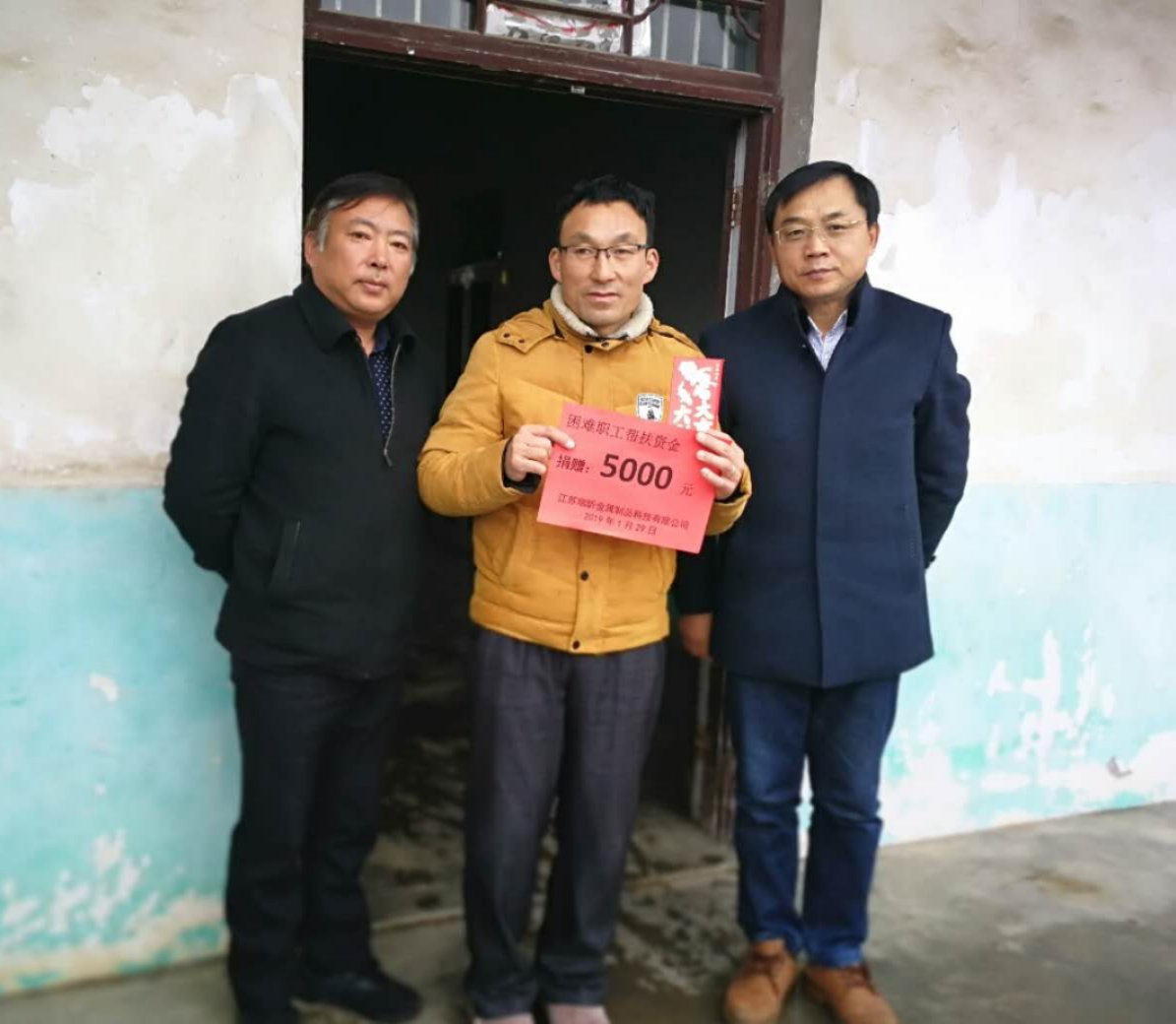 1月31日,春節前夕,受江蘇瑞昕金屬制品科技有限公司周建國董事長委托,公司常務副總居云龍攜公司副總經理、工會主席、總經理助理等一行看望慰問企業困難職工和貧困群眾,代表公司送去新春的問候和祝福。