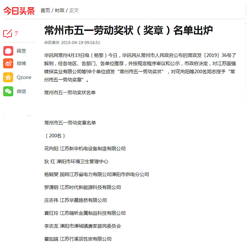 今日從市總工會獲悉,常州市人民政府已發布2019年常州市“五一勞動獎狀(獎章)”表彰人選(集體)公示名單,常州多家單位和個人入圍。其中,我江蘇端昕公司有1人入圍常州市“五一勞動獎章”名單。