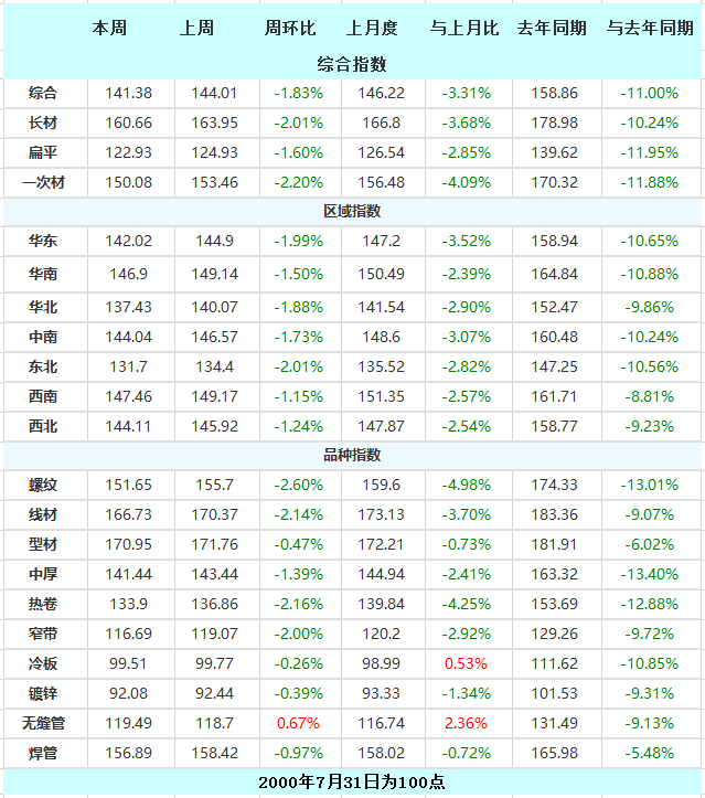 本周Myspic綜合指數報141.38點,較上一周下跌1.83%。其中,長材指數報160.66點,較上一周下跌2.01%。本周建筑鋼材市場價格下跌,全國25個市場螺紋HRB400(20mm)均價為3866元/噸,較上周下跌127元/噸。